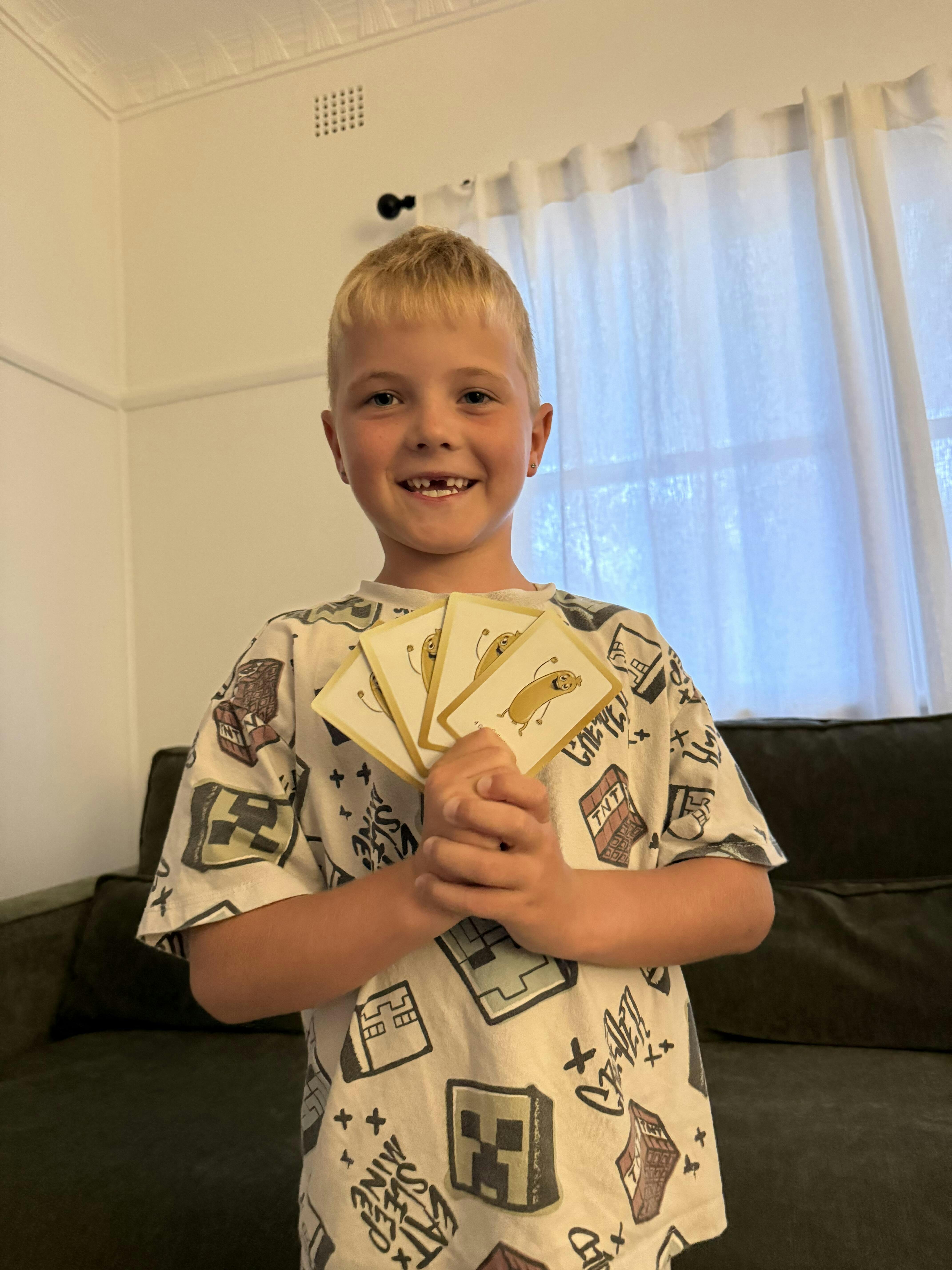 My family absolutely loves this game! I have 2 boys (5 & 6) and they now want to play this every night instead of watching tv. So far my 6yr old has won every round and makes sure to remind us regularly 😂. Super fun, easy game to follow. Fun for all ages. The cheeky yeah/nah card is a fav of ours. Golden sausage game is 10/10.